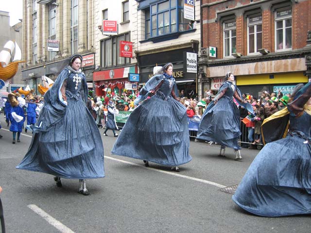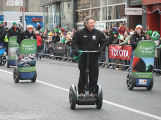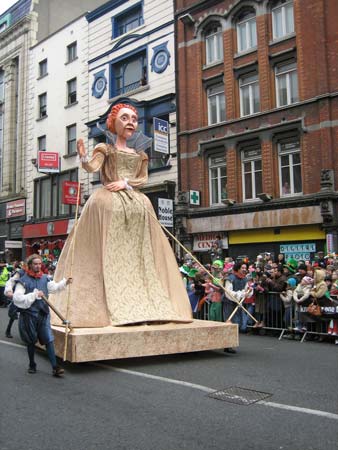 With nothing better to do, I decided to walk up to Grafton Street and get something to eat and drink. A black knit cap with an Ireland badge on it caught my eye on a display and I decided that would be a good souvenir. I asked the girls manning the stand if they could break a 50 and they said “no.” I grabbed my handful of Euro coins and counted out 8.50. I asked if that would work and the answer was “yes.” Arriving at Grafton and crossing the street by the Molly Malone statue, I heard “Terry” and found my Intel pals coming in the opposite direction. A bit of a surprise. I bought a bottle of water, a banana and yet another Pain au Chocolate and we headed off to find a spot to watch the parade.