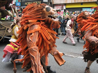 A German oompa band comprised of middle-agers trooped past, dressed all in gray. Most amazing though were the ad-hoc groups of adults and children dressed in screamingly loud colors in all manner of surreal outfits. Pirates, men in hairy suits with big bunches of bells on their backs, half-horse people, cavaliers, fish monsters, a bright band of Sikhs, little girls carrying streamers swirling in the wind, some ships, Queen Elizabeth 1, a giant troll and a enormous dinosaur. Lions, kings, dancing ladies, King Midas himself and his court, all dressed in gold, men with wicker cages for heads and people driving a cart with wispy white horses towering over the crowds. A giant aligator and Dracula. All conceived in that odd Euro-aesthetic that we rarely see on our side of the pond. Honestly, I’ve not seen anything like it. It just went on and on, defying description and overloaded your senses.