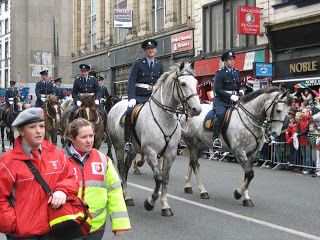 We walked alone Dame Street and found a spot in front of a coffee shop and a pub, two key support zones for a day that was now becoming windy, overcast and sprinkly. Slowly but surely, the crowd built and the crush began. We allowed several children to move up to the barrier so they could see better, but managed to maintain a more or less unobstructed view.