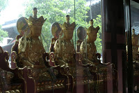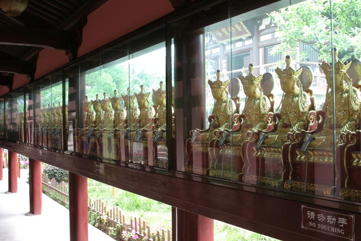 Red candles were burning in the main square and red banners festooned each and every tree. These I assume are prayers. One room contained 100 identical Buddhas sitting peacefully on their thrones. One large Buddha was painted to appear human. The others were gold clad.