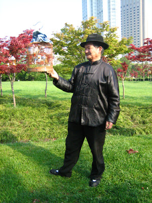 The morning was truly glorious, yesterday’s downpours cleaned the air, the sun was out and I could see my breath as I ambled through the misty bamboo. I approached the bird keepers, found my friend and smiled and nodded. He recognized me and came over when I stopped to look at his bird. In my best broken Chinese I asked permission to take a photo with him and his bird and he just beamed. Stepping off the path and onto the grass, he gently lifted the cage and looking at his friends he said something, I imagine on the order of “check this out, the lao wei is taking my picture.” And then, with him bearing an incredible look of pride for his bird, I counted to three in Chinese and snapped the shot.
