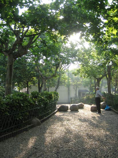 Late spring is upon us here and even this morning was pretty sticky as we headed out for a morning walk. Even at 6:3o, the streets were buzzing and it was easy to work up a patina with even the slightest notion of a power walk. We decided to head down to Rotting Patrol Boat Park but walked past and on to the bigger version across the street. It was busy in there today with many people waving flags and doing tai chi. Exiting on the far side and planning to re-enter on the other side of the block, I noticed the Carrefore store looming in the distance. Lo and behold I had discovered a short cut to Zhongshan Park. Let no challenge be left unaccepted is my motto and so off we went to the bigger, better greenspace up the road.