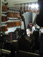 The area around the restaurant is great for a stroll so we decided to walk off some of the food and headed out and down the street. Like every other neighborhood here, it was busy. Most interesting though was the violin shop we encountered, the walls lined with instruments and a few people sitting around a table busy in a flurry of re-stringing.