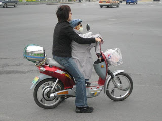 After an hour it was time to head back to my convalescence. I took an easy stroll down the street stopping at the crossing to sneak a picture of this woman with her child on a scooter. The kid had a mask, sunglasses and an adult jacket on, providing a makeshift cocoon protecting him from the exhaust.