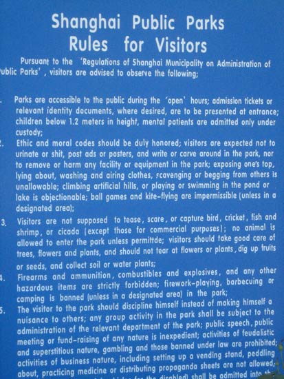 Approaching the ticket machine we looked at the options and another traveler’s aide stepped in to help us. Traveler’s Aide #1 came back and waded into the fray. At this point I figured the best bet was to simply ask what station was closest to Handan Lu, the road that led to the park in question. Neither could understand why I would want to go to a certain street. Traveler’s Aide #2 suggested we take a bus, I said no bus. I tried to get my map out and got totally flustered trying to find the correct side of it which greatly amused both Travelers’ Aides #1 and #2. At this point, Megaphone Woman showed up for a third time still going on about how dense these lao wei must be to need three sets of instructions when hers were just fine in the first place. Still failing to grasp the notion of riding to Handan Lu, Traveler’s Aide #2 asked whether we didn’t really just want to go to Tongji University and I figured that was the best we were going to get so I said “yes” and they told us to get back on and then off at Chifen Lu. We bought our tickets and departed amidst a flurry of “zai jians” and “xie xies”, we being happy to be on our way and they being happy to get us the heck out of their station.