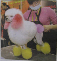 The horror! This fad seems to be sweeping prosperous China where little white poodles are now being subjected to this demeaning practice. Next time you’re over, you can check out the poodle supply at Shanghai Naughty Family Pet Co. LTD on Hongqiao Road. (No, I am not kidding.)