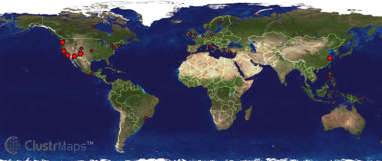 Still trying to kick the last of my weekend malaise, hoping to put the bugs to rest before I board the plane on Thursday. Looking at the IP Cluster map on the sidebar of my blog, I noticed we’ve added a viewer on the west side of Hudson Bay. Do they have internet access up there? It’s turning into an eclectic little community. On our side of the world we have Oregon, California, Arizona, New Mexico and somewhere in the middle of the country. That plus upstate and downstate New York, Massachusetts and southern Mexico. One reader visited from Brazil. On the far side, Ireland, Sweden, the UK, Belgium, Germany, Italy and Turkey. On the very far side, China of course and the Philippines. Our small world continues to shrink. I’m reproducing it before in an act of oddball recursiveness, but to check on it in the future, just click on it and so ye shall be delivered. When you do, spend a moment thinking out our visitor in the Arctic reaches of Canada.