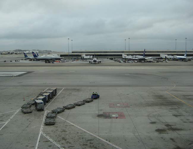The bus loader stepped onto the platform and said in broken English – “Stop 1 United, Stop 2 Canada Air” and stepped off. The driver drove off. We had to wait a minute while a 737 crossed our path and then we made the regular u-turn to the disembarking area. We stopped and the driver said in broken English “United Stop 1.” The passengers looked dismayed and confused. A murmur went through the crowd, “is this United, I think he said United.” I cleared it up by loudly telling one lost soul that this in fact was United. Even the concerns of the guy wearing shants, a size XXL Hawaiian shirt and a crumpled straw cowboy hat was put to rest. I think he was on his way to Mexico.