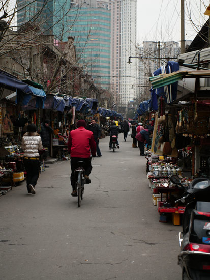 After the walk around Yu Gardens and a stroll through the neighborhoods in the Old City, we went looking for the Bird Market, one of my favorite little holes in the wall. I didn’t have my map with me and so I had to go from memory and while it took a long walk down Zhonghua Road and up Tibet Road and across to Dongping Road where I reached the depths of despair at my inability to find it, I finally persevered and went back to Tibet Road and found it. It’s an interesting place, flowers out front and a warren of stalls inside an old building with a glass roof. One line of puppy stalls including one that had a tiny pug sadly ensconced in a cage with five tiny kittens. You could see the embarrassment on his little wrinkled face. Next line is fish and tables of aquarium supplies. Then comes tables of crickets and katydids, clicking away in tiny plastic cages. Finally rows upon rows of songbirds, moved back into the building due to the cold out front. A few chickens scratch around between the tables and a big cat walked the roof line over the tops of the stalls. Hundreds of singing Thrushes, Finches and Parrots in banks of cages illuminated by heat lamps. Saddest of all though were what appeared to be some sort of Lark, clearly just taken from the steppes, bobbing around in the bottom of a bird cage, wondering by what ill fortune they had ended up there.