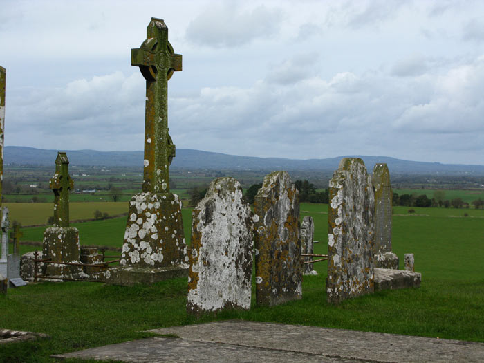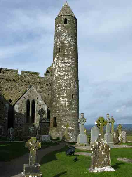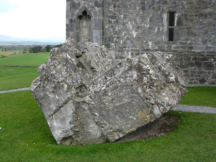These shots show some of the interesting elements of the site. The graveyard had headstones spanning from the mid 1600s to the present and the view of the green expanse of the Golden Vale from the hill was spectacular. The big rock below shows what happens with the corner of a castle falls off – it makes a dent in the ground and lies there, just as it fell. In this case, the parapet was blown off in a wind storm in the early 1900s. The cathedral has seen restoration limited to stabilization, and lots of the beautiful parts are still intact, soaring to the heavens just as they did when built in the 13th century. The round tower is one of the best in Ireland and is built in the “dry stone” style, which is to say with shaped rocks and no mortar. The entrance is about 12 feet above the ground, allowing the monks to remain safely ensconced until the Vikings got bored and wandered off to pillage something else.