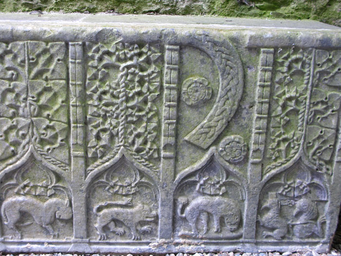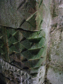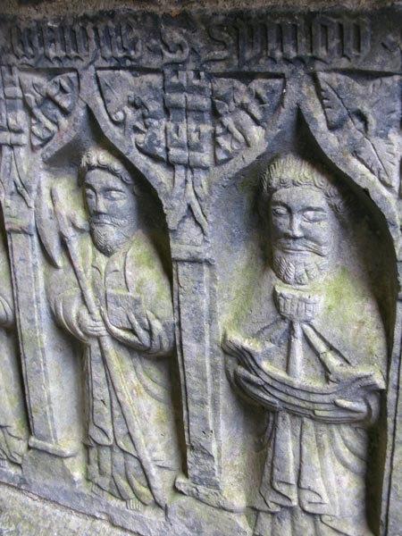 These carvings are mostly from the period of 1400 to 1600. The first shot is dated at 1574 which you can clearly see in the upper right corner. I found the crypt lid carving of the interned nobleman, his coat of arms at his head, quite impressive.