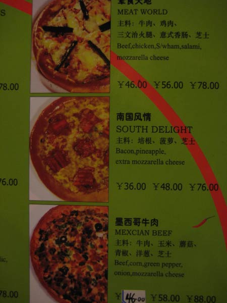 We decided to make it easy tonight an visit Pizza King, an old haunt from visits of the past. It’s smack across the street from the Shangri La, the food is good and it’s just plain simple. Besides, where can you get a pizza and a mug of beer in a pizzeria with live entertainment belted out in a grand piano? The menu provides some gems, as seen below –
