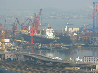 Dawn breaks early this time of year in a place with no Daylight Saving adjustment, the sun starts streaming in the window about 4 Am. I resisted the urge for a long, long time until I finally gave in and got up about 30 minutes earlier than planned. The day looked pretty nice with the shipyard across the way clearly visible through the light haze. The weather held and we had sun all day long, although at the end, with the sun still pretty high up in the sky, the light looked like dust, such was the filtering power of the stuff pumped into the air during the work day.