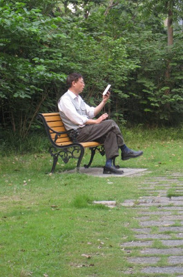 Down the path and around the bend I came across this man, singing in a soft, clear voice from the book he held. Not sure if these were traditional Chinese songs or hymns or what, but it was very pleasant and peaceful to listen to, and quite a contrast to the traffic noise and the yelling exercisers off in the distance.
