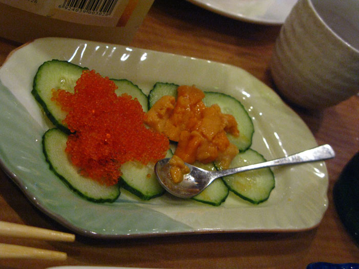 Each of us at one time or another has ventured forth and tried something that caused immediate regret after sitting in the mouth for a second or two. Up until now, I have had to face that urgency, do I swallow or do I discretely find a way to spit this out. Asian restaurants do not give napkins, so the latter choice is out. Instead, you try to get it down as quickly as possible. This one was mine – sea urchin. The taste was not bad, but the consistency, which I will leave to your imagination was completely alien to the universe of things that we westerners comfortably eat. As I started with the urchin, I saw no point in eating the roe.