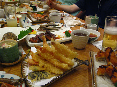 I finally took a shot of the other end of the table. Going from front to back – tempura prawns and vegetables, barbecued eel, some little fishes stuffed with roe, and shrimp on a skewer.