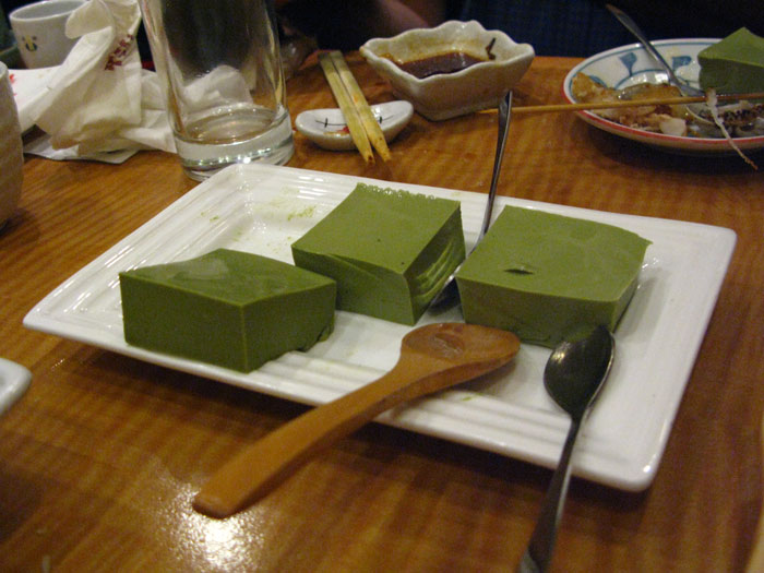 Finally desert – green tea mousse. Truly the consistency of the Junket we ate as children, and bearing that unmistakable flavor of old ashtray that only green tea can give. It grabs you on the first bite and then slowly morphs into something more pleasurable. I have to say, I liked it. It was a cool, pleasant end to a evening’s banquet.