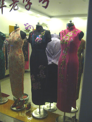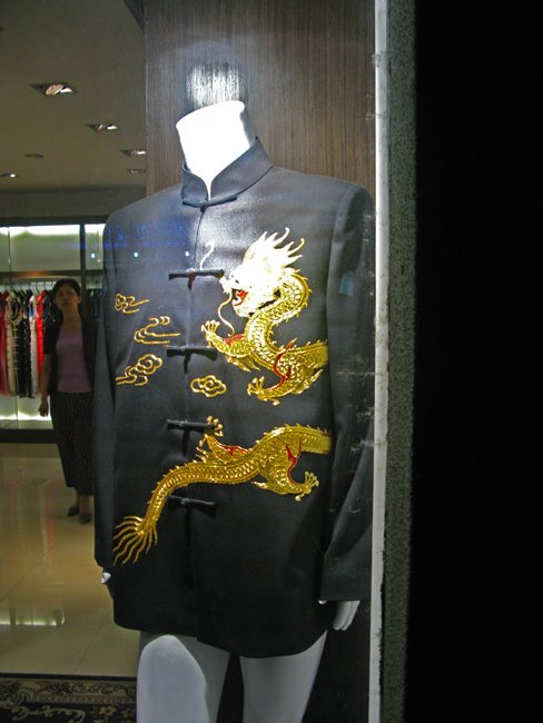 The area around the Ruijin Hotel, home to the Face Bar is part of the old French Concession and viewed by just about everyone as the nicest part of Shanghai. The streets are narrow and lined with tall Plane Trees, sporting the biggest leaves you’ve ever seen. Little shops selling very elegant women’s clothing mingle with tiny restaurants and the occasional custom jewelry store. The pace is slow, the goods are beautiful and when the weather is nice, you’re not sure if you’re here or Saigon or Paris. The night just envelopes you. I took a few pictures as we walked along, starting with the big lantern outside the bar and ending with some clothing in the shop windows. The jacket with the gold embroidered dragons was something to behold, and my meager photograph barely does it justice.