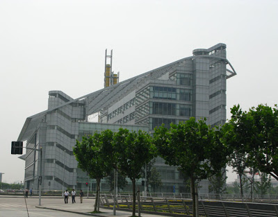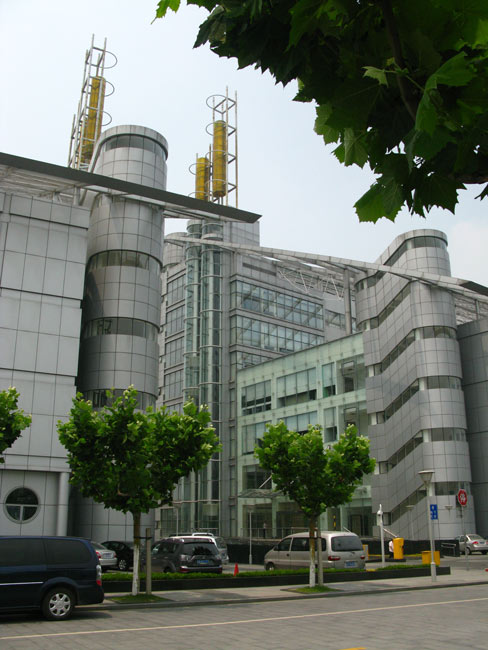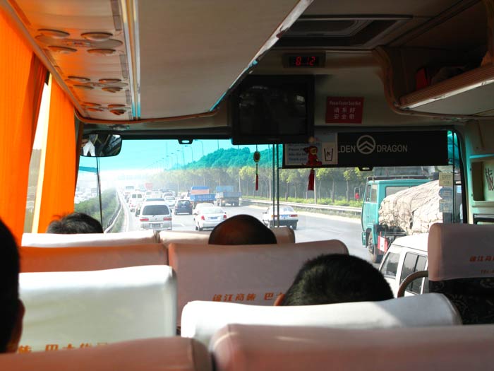 We began our Thursday with a ride on the corporate shuttle out to the other site in town, located on the far, far edge of Shanghai. You get so used to being hemmed in my multi-story buildings here that one tends to forget that the city has some bounds and that the concrete will eventually give way to the countryside. Our ride out was not the traditional corporate, rather it was one of those comfy touring buses that you see out on the interstates when they are not jamming up parking lots at national parks. This one was pretty nice and very well-appointed, the only problem being the former taxi driver at the helm. He forgot he wasn’t in a Volkswagen Santana and chose to drive this thing as though he was. I’m not prone to car sickness, but this guy’s style challenged even my inner ear and the rolling from lee to starboard with every maneuver came close to making me green. Here’s a shot of the traffic out the front.