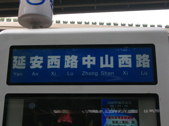 Lastly, today I found a modern version of the Rosetta Stone, the very first time I have seen characters and Pinyin on a sign together. And the basic translation is “Yangtze West Road and Center Mountain West Road” indicating that this particular bus stop is at the intersection of those two thoroughfares.