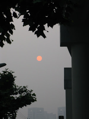This morning we got out early, about 5:35 to take in the two parks down the road, just for a change of scenery. The sun was nearly occluded by the thick, wet air and presented a milky, tangerine vision over the street.