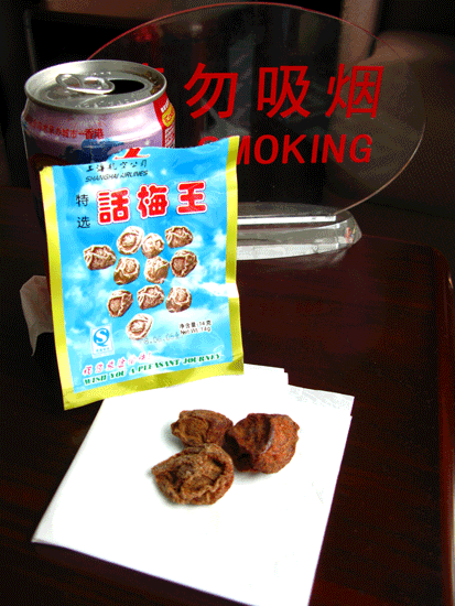 This was my first outing on Shanghai’s eponymous carrier and I’ll say it was impressive. We left on time, the staff bowed to us as the read the safety information and the plane was clean and comfortable. Best of all was the in-flight snack – a bag of sugared walnuts, a dinner roll stuffed with dried plum goop, a mocha flavored muffin, a cherry flavored semi-hard candy and a bag of mint-flavored cough drops. Yes, cough drops. Are they trying to tell us something about the air?