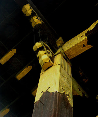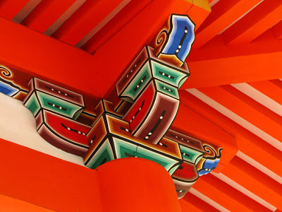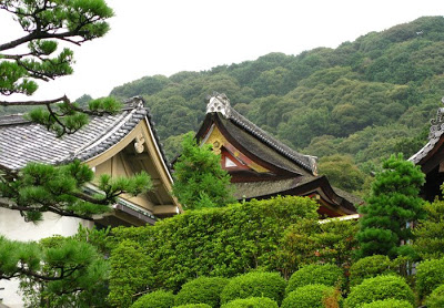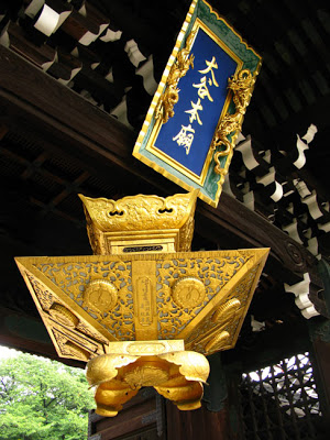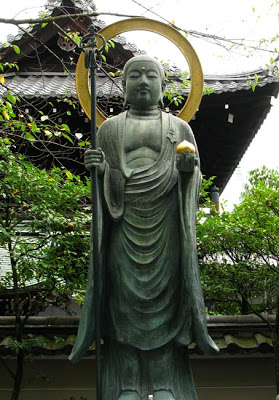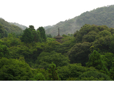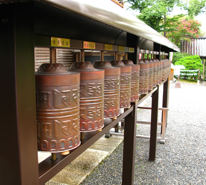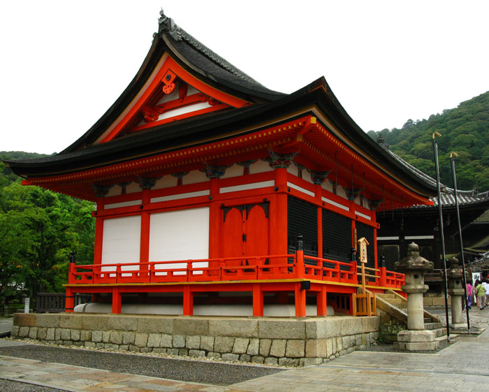 After entering through a massive timber gate, you climb several hundred feet of stairs formed from 15 inch stone blocks bringing you to an open space on the hillside that holds 4 main buildings. The purification font in front of the main temple was a welcome means to cooling off after the climb. We headed over to the big building and removed our shoes, placing them in plastic garbage bags that were offered for that purpose. Up a very steep set of wooden steps, we entered a large temple hall and sat down on tatami mats. A monk was performing a ceremony, chanting and sporadically beating on a large, deep sounding drum. A woman walked in and entered a small office to my left and spoke with a monk behind a desk. The monk rose and brought the woman to an altar off to the left of the temple where she knelt in prayer. The monk stopped by and said a few words to his chanting brother and the chanting stopped. The office monk left and the chanting monk got up and moved to the right, sitting in a new location and beginning a new chant, this time striking the most mellifluous gong which rang true and clear, resonating for many seconds with each strike. I closed my eyes and sat there soaking it all in. Other people in the hall would occasionally stand up, approach the main altar tossing a few coins over the rail and then kneel in prayer.