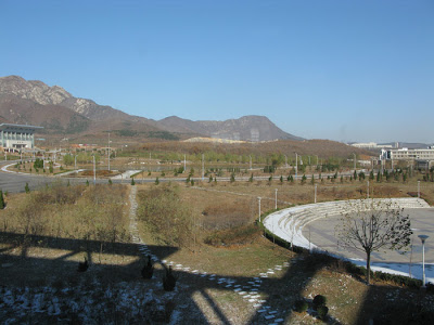 I took these photos of the view out the window of my, a panorama from right to left showing the grounds of the university and the hills in the background. Yes, it is just as cold as it looks.