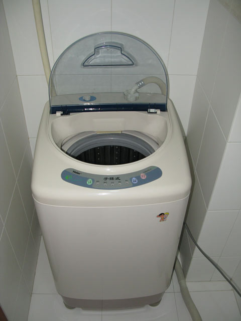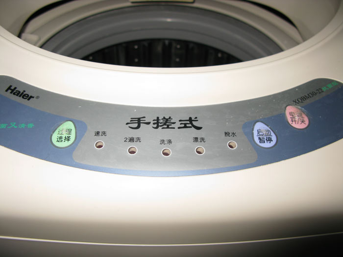The washing machine was another story. This place one and it’s a cute little R2D2 of a thing residing in its own little ceramic tiled vault off the kitchen. It didn’t look terribly threatening there squatting in its little white home, and of course a washer should be obvious enough, except the fact that the control panel is completely in Chinese. Well, except for the brand which is in English, the designer obviously feeling that it was more important to advertise the manufacturer in universal terms and less so how to run the thing. Having conquered the router though, I figured I had proven myself to be worthy of my spot at the top of the electronics food chain and so I hatched a plan to do an empty cycle by punching buttons and observing.