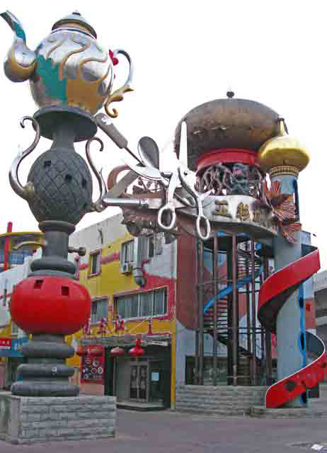 This time I a long path around the back of the mall figuring I would stop in for an Americano (but no muffin, Rudi) passing by fruit and vegetable vendors and one guy selling the kid of fancy glass objet d’ arte that we buy in galleries back home. Today was An Sheng Mall’s 5th anniversary and there were giant inflatable red arches and blaring Chinese pop music to entice shoppers in for the discounts.