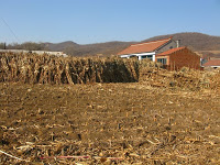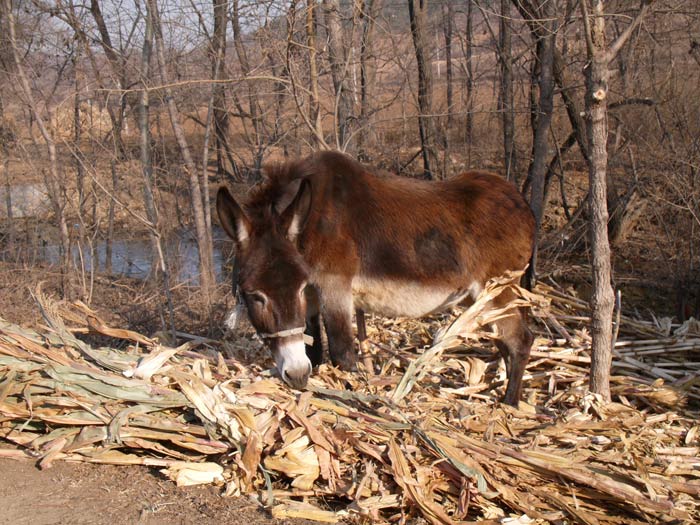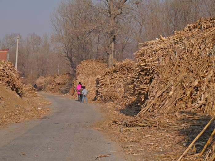 What caught my eye along this stretch was the sheer volume of cordwood and corn shucks piled along the road. This giant mass of plant matter provides the basis for winter subsistence in these villages – fuel for the houses, bedding and food for the animals, insulation for the dark side of the house. The quantity was staggering; the straight sections of the road here were lined with giant stacks of it, narrowing the lane down further. Every home had a big pile, often stacked in the shape of a pitch-roofed cottage. Cows and donkeys tethered to the side of the road made an afternoon snack of it.