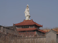 We took the wrong way out of a t-intersection and got turned around by a helpful woman who was trying to board a bus. Heading down the road, we took our next bearings by pulling alongside two guys on a motorcycle and asking them for directions as they rode down the shoulder and we held up the driving lane. We were heading in the right direction and I suspected as much as I could see what appeared to be a tall statue of Guanyin off in the distance, sharing a hill with what looked like a gravel mining operation. I pointed this out to James, but he didn’t seem interested. Chinese drivers do not reconnoiter the way I do, they prefer to the constant set of selective approximations they get from asking pedestrians. Their way works, but more often than not it does not result in the most direct route.