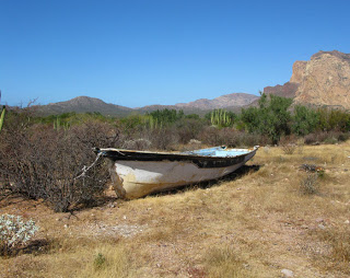 The road we chose to head back on ran pretty much parallel to the coast but as always unguided bushwhacking sets me to wondering if we’re not going to drive 30 miles off into the wilderness and end up behind some locked gate. However, simply relying on the Rule of Turns (always take whatever right or left presents itself) we ended up back on a road to La Manga. What gave it away was the ever increasing amount of trash along the road – we’d found way into yet another linear dump, this one without any Cattle Egret but one graced with a fully functional fishing boat neatly tied up to a mesquite tree a mile from the ocean. It was waiting for the day when the oceans rise and the waves lap again at this little copse in the middle of the desert.