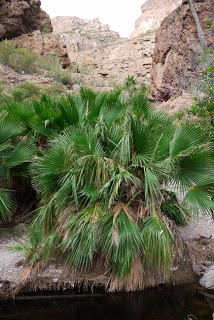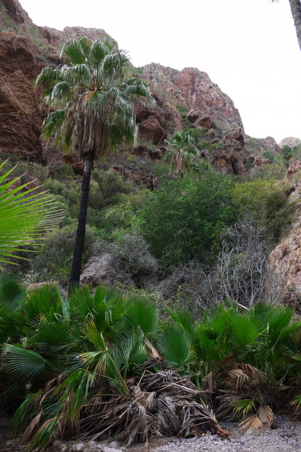 You head down a slope and then walk a flat rocky path that runs alongside a dry stream bed for the first third of the trail. Then the path heads up and eventually ends at a broad amphitheater which offers a couple of ways up and out. We stopped and enjoyed the sound of the wind through the palms and the twittering of warblers and kinglets in the brush. Something big and rough sounding added a croak or two, unseen but clearly nearby. An Elegant Trogon began to call high up and far away, giving me the one bird I had hoped to see or at least hear. A small clear pond filled a basin in the stream bed here, disappearing beneath the rocks as it began its trip down to sea level. It’s a pretty nice place if you over look the graffiti and the Doritos bags, far nicer when there are no people around. Our time sitting there listening brought to mind the other canyon here in town where we began out count so many years ago, off the back of the harbor and just over the ridge from the site where the film Catch 22 was filmed almost a half century ago. That place – palm lined and grassy had been turned into a construction debris dump on our last visit, and on this trip had become more or less impassable. A genuine loss in my book.