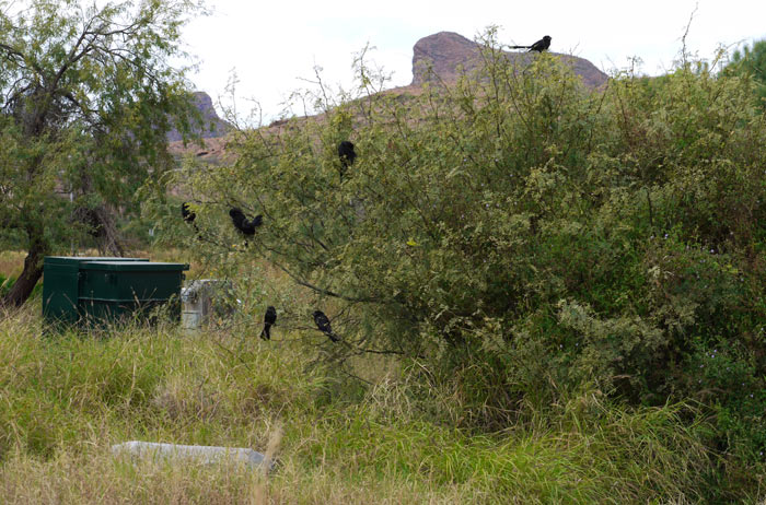 Heading back home we decided to take a spin through the La Posada parking lot to assess how their renovation was coming along. What used to be the fanciest place in town has now become a bipolar vacation spot – the newly refurbished hotel towers contrasting with the seedy and shopworn main buildings which still house the sales offices. It brought to mind a tired old section of Miami Beach where the golden days of tourism were long since gone. Coming around and out of the parking lot, I said “This is prime Ani territory” and as if instantly granted a wish by Rhiannon, the Celtic Goddess of the Birds, My Lovely Wife said “Stop and back up.” There at the edge of a weedy lot was a bush full of Groove-billed Anis.