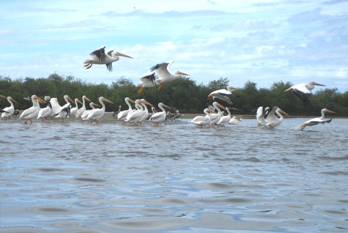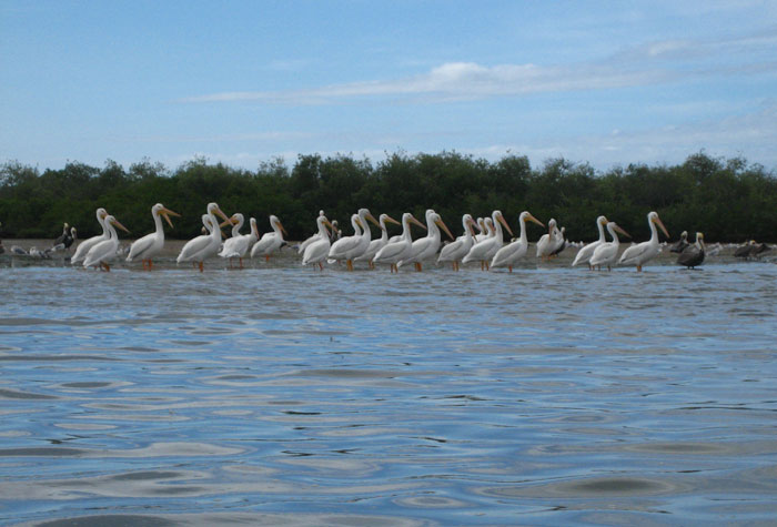 Coming out to the intersection of this inlet and the main body of water, I was immediately taken aback by the sight of White Pelicans resting on an emerging mudflat. Over the course of the past few days, our count of them had increased from seven to twenty-eight, a pretty amazing change compared to what we’ve seen in previous years. But this was something completely unprecedented and I purposely grounded my boat to take a moment to count them – seventy-eight, an incredible number for this spot. The other two boaters had realized there was no path around due to the shallow water and so had back tracked and taken the outside route along the groves. I followed and while coming around into the deeper water had a chat with one of them about the birds, where he lived (north of Eureka, California) and the cost of having kids in college in Colorado. I left him once I hit the deep water and headed along the mudflats, stopping again to count the Pelicans – ninety-three once the full flock was in view.