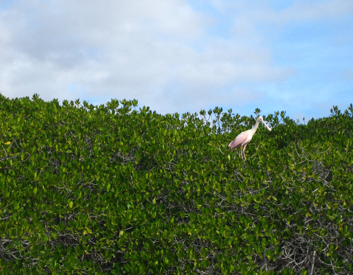 On a whim, I took an easy left into a small cul de sac and immediately faced a grove full of birds – Great Blue Heron, Snowy Egret, Great Egret, Reddish Egret, an Eared Grebe in the water and in the middle of this was the elusive Roseate Spoonbill, sitting there in its soft pink splendor. I stopped paddling and just glided along, fumbling to get my little camera out of the baggie where I had stowed it in my life vest. I took a few pictures and watched the birds, watching me. One or two of them could not tolerate my proximity and so off they went, squawking in protest. The Spoonbill stayed until the very last moment before launching itself into the air and up and over the grove across the water. The Great Blue let out a harsh yell as if to tell it to ignore me, knowing I would be gone in a moment or two. But the Spoonbill would have none of it and it disappeared over the tree tops, not to be seen again this day. It’s amazing to me how hard such a big and bright bird can be to locate – in this environment they could be ten feet away and you’d paddle right past none the wiser.