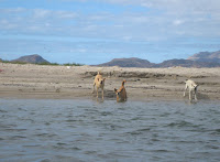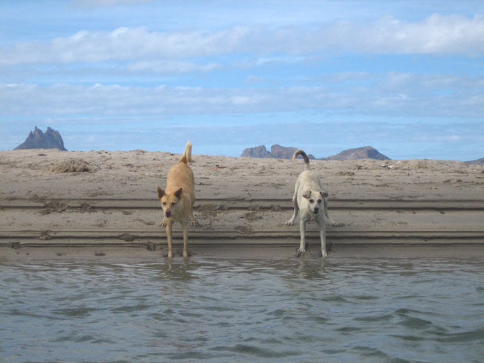 There used to be a fish camp here which has now also disappeared along with the oyster farmer mentioned yesterday, the only remnants being some blown down shacks, piles of shells, trash and four barking dogs. We first encountered these canine nuisances a couple of days ago when they stood across the inlet barking at us as we combed the shore for shells at the lowest tide. At the time we wondered how they survived without food or water, yet there they were looking quite healthy and judging by their barking and aggression, feeling well too. Now though, they stood on the strand and barked endlessly as I passed by. Realizing this was too good to be true – I mean, being chased by dogs in a kayak? – I pulled up and egged them on while getting a good look. It appeared as though we had one old mom dog, white muzzled and only capable of barking for a minute before getting hoarse, in league with what was probably a generation or two of offspring. Two of her sons supported her in protecting their range while the third kept running up and trying to interest his siblings in going off and barking at something else. I sat there laughing out loud and barking back at them which only served to tune them up even more. I splashed them with my paddle and they simply closed their eyes and kept on barking. As the breeze was now across my boat, I was slowly inching in closer to the shore which got me thinking what was going to happen when I got really close to them. They figured that out too and started wading into the water, getting closer to the bow. Figuring that barking was bad enough, but actually being attacked was far worse, I put the boat in reverse and backed off a bit. They stopped at chest depth and a couple of more paddle splashes sent them back to dry land.
