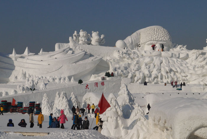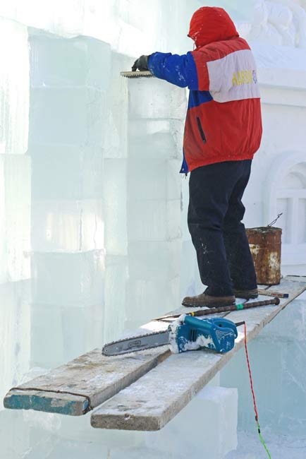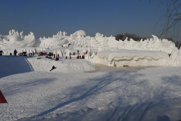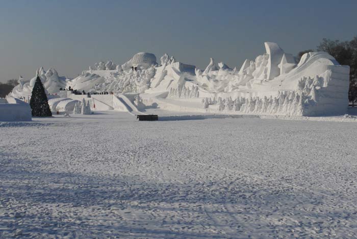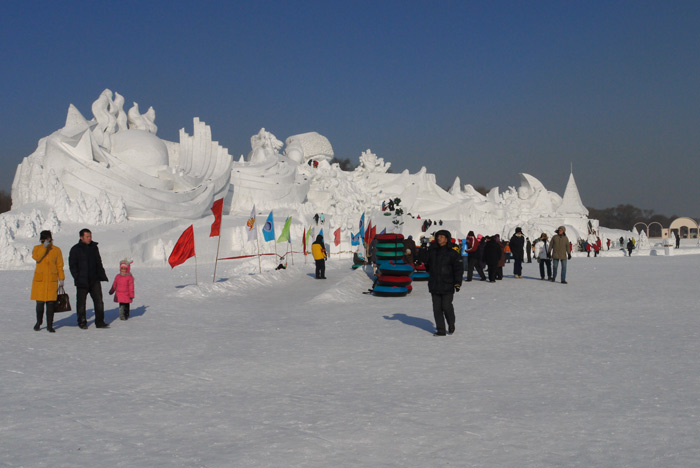 You enter the park through a gate that leads to a bridge back across a braid of the Songhua to a river island called Sun. You start your tour by walking down a broad boulevard lined with massive snow sculptures. It’s worth mentioning that the boulevard is paved with marble tiles, a fact that I noticed when I almost went down flat when my shoe caught the edge of the path which was lined in marble of the super polished variety. Only here would park designers deign to use the world’s most slippery flooring material in a place that is covered in loose snow for 7 months of the year. For the rest of the day we had a running laugh going each time someone put a foot down and did the splits.
