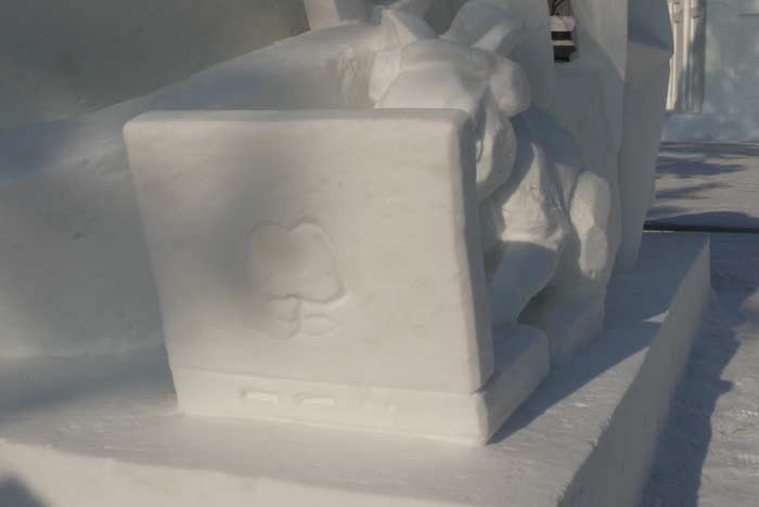 I was pretty impressed at this point, the work was beautiful, and I was able to see the sculptors in action with their chainsaws, hand trowels and sanding blocks. I had more than received $10 worth of enjoyment and would have been happy to call it a day. But the best part is often just around the corner, and it was true here. We found ourselves in the competition portion of the festival, the place where individuals and groups take standard size blocks of compressed snow and work their magic. Whimsical was the word of the day and each individual sculpture was a true work of art. Lions fighting alligators, a skeleton riding a dragon, a giant sphere parked next to a giant cube made me think of The Borg. The grand prize winner was an Alice in Wonderland themed work with the Mad Hare typing away on an Apple computer. It was simply amazing and again it would have been fine if that was all there was but there was more surprise – behind the church was the centerpiece of the park – a giant Christmas themed massif of carved snow. I don’t think I can accurately estimate just how big it was, perhaps 500 yards long and 50 feet high, carved from end to end. A tubing slide from the middle to the bottom beckoned and I paid $4 for the joy of riding it twice.