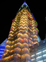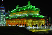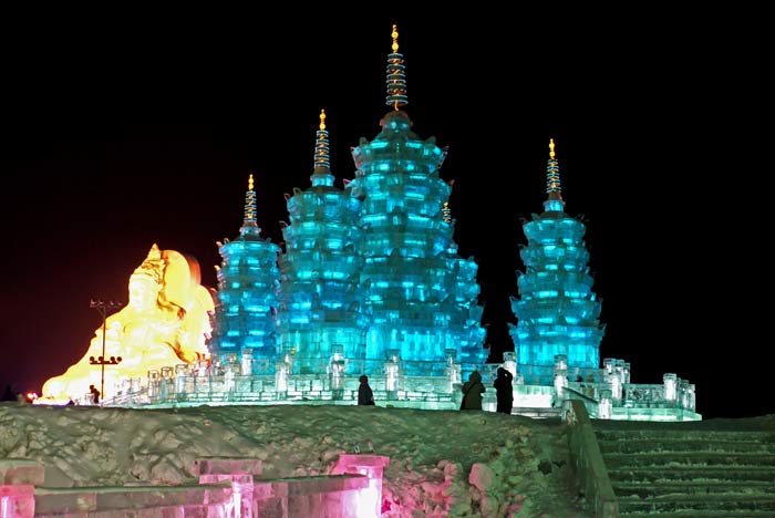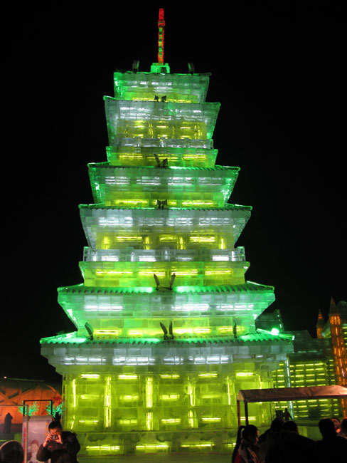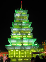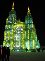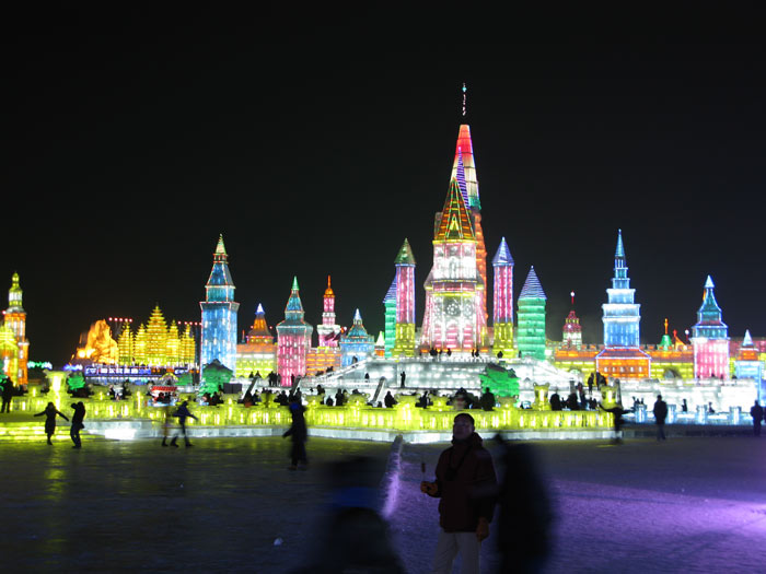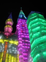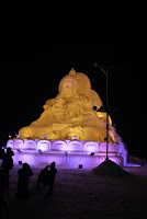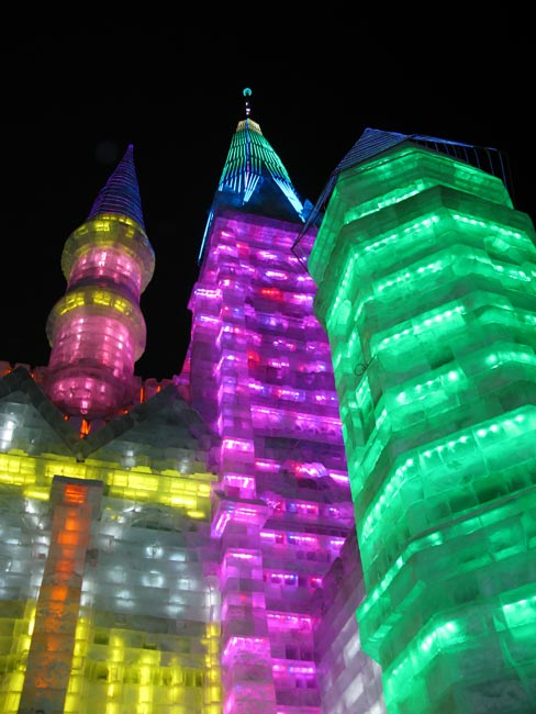 I wandered around taking pictures until my camera battery finally died. Normally I could have squeezed a few dozen shots out of it but the cold was draining it at a higher than usual rate. All around us were pagodas, temples, cathedrals in the Christian and Orthodox style, the theme was places of worship. My favorite was a giant Buddha illuminated in soft yellow light. Prayer rugs were supplied for anyone willing to put their knees down on the frozen ground. A Greek Temple illuminated in shocking yellow stood up on a hill with ice slides leading back down to the main plaza. Techno music pounded across the square from the front of one huge building. We tried to get hot chocolate at a Nescafe tent but the place was too chaotic for my tastes so we kept on walking, eventually splitting up because we had different intentions. Several wanted to amble and several wanted to walk, so the logical conclusion was to go our separate ways for a while.