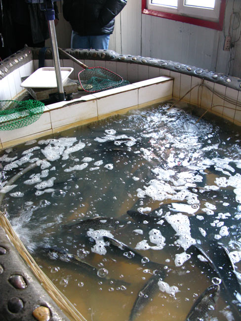 The inside of the building was smoky and a bit dim, illuminated only by shafts of sunlight coming from windows up above beaming down through an opening in the second floor. The room was tall and the upper level was a railed walkway overlooking the entrance. Paper cutout Santa Clause heads decorated the walls. A friendly young woman showed us to a room off to the side where we found our long errant friends, already deep into their meal. The drivers greeted each other and said something and the other guy smiled a big smile and waved us out of the room. The hostess took charge and told me how the place worked, none of which I understood; I nodded a lot and smiled obviously indicating our willingness to stay and eat. Our driver motioned me to follow and we went back outside to a small shack off of the walkway. Entering we found ourselves in front of water filled rowboat teeming with big black fish – dinner on the hoof.
