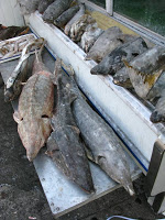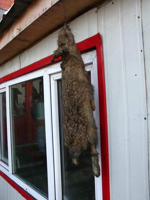 She then directed us to three large kettles long the side of the shack lifting each lid and giving a description of the simmering contents. These were apparently appetizers meant to hold us over until our big fish was prepared. Each was less attractive than the prior so we selected the least odious option, some sort of chicken curry and went outside. Our guide pointed to a rabbit hanging from the eaves and asked if we wanted it, I said no. As we headed back in we passed a table covered with the frozen bodies of some sort of Sturgeon which were also offered. Again I declined.