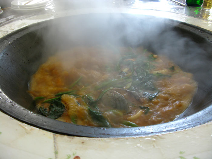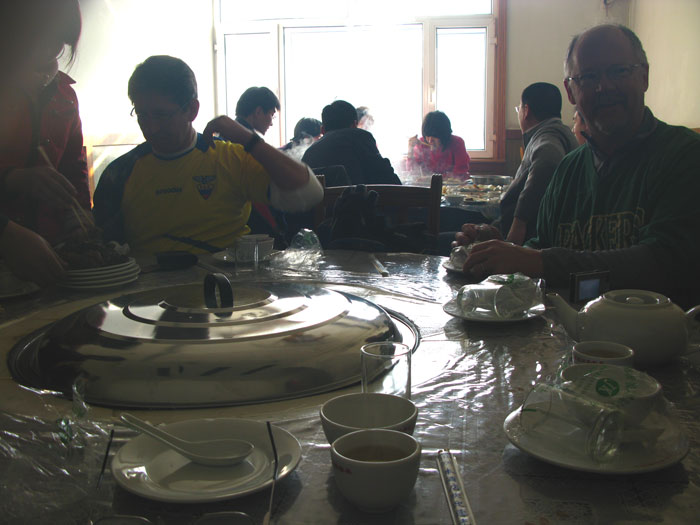 We were led upstairs to a smoky room with two large round tables one occupied by a Chinese family who found us either quite amusing or shocking; it was hard to tell from the quality of their stares. We sat down at the other and a worker came in with some firewood. Kneeling, she opened an iron door in the side of the table, put the wood in and lit a fire. The table was sitting on a big cylinder of bricks and the fire was within. A small chimney exited on the opposite side from the little door and connected to duct work that went up and out through the ceiling.