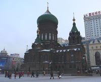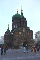 It was now mid-afternoon and we had some time to kill as it was our plan to arrive at the Ice City just about sunset. Someone had printed out a couple of pages from a China guide and so I showed the driver some pictures and asked him if he knew where they were. “No” on the world famous pagoda, “yes” on St. Sophia’s Church in downtown Harbin so off we went into the streets which were at this time of day completely choked with traffic. We did make a truly infuriating side trip when someone wanted beer and the driver pretended to not understand what a store was. That solved we made our way to the church which sits in a broad square in the shopping district.