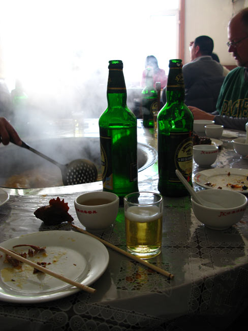 One of the people from the other party came up with a little flask of “bei jiu” which is Chinese hard liquor along the lines of tequila. There is a funny play on words with its name – “hong jiu” is red wine and it might make sense that if you replace the “hong” with the word for white, “bei” that you’d get white wine. Well, plenty of delicate westerners have been surprised to discover that you end up with grain alcohol if you place that order. To get true white wine, you have to specify it by adding the word for grapes, “bei putao jiu.”