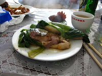 The chicken curry was brought and we had some fun fishing through and commenting on the various pieces including the head, still sporting its bright red comb. One of my companions made a point of picking it up to pose for a picture and promptly dropped it on the floor. So much for chopstick skills, I retrieved it and gave it a place of honor in front of my plate.