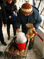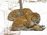 Some people had decided to go for the whole bird and so the chickens were attached by their feet to bamboo poles and dangled out over the tigers which milled around trying to decide who was cat enough to make the leap. A few had a half-hearted go at it to which the person doing the dangling would raise the bird up, just out of reach. It was not at all unlike teasing Fluffy on Christmas morning with her new catnip toy except that the chicken had a lot more invested in this game. One big cat finally connected and made off with the bird. I’d hoped that the chickens went quickly, suffocated in the jaws of those big brutes but I was quickly disabused of that illusion when I rounded the corner and saw the cat stretched out, holding the still alive bird in its massive paws, pulling out one feather at a time. I’d had enough, it was freezing, the weather was getting worse and I couldn’t witness any more animal abuse. This morning had pretty much cured me of my bad feelings about sending that big fish to the pot the day before.