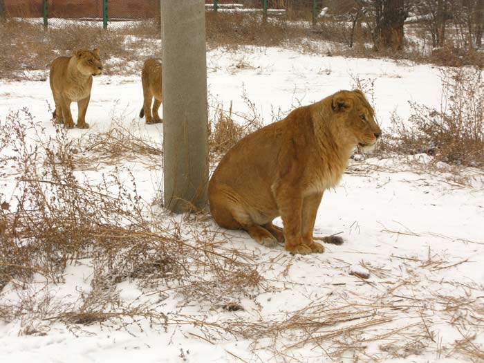 We drove on passing through a pride of lions which perked up at the same time, doing that laser focused vision thing you see them do on “Nature.” They must have liked what they saw, because they went tearing after it. They are kept here to support a Liger breeding program and so not were not unexpected. But Lions in the snow are still odd an sight indeed.