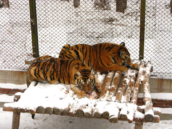 Out in a snowy field you really gain a perspective on just how big tigers are, they’re like horses with short legs. We saw dozens of them in repose, walking around, sitting on buildings, growling at the gates, lying on their backs, reclining in piles, getting amorous, I eventually lost count.